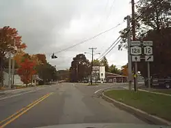 In 1908, the New York State Legislature created Route 8, an unsigned legislative route extending from the city of Binghamton to Kirkland.[4][5] When the first set of posted routes in New York were assigned in 1924, all of Route 8 between Chenango Forks and Clinton became part of NY 12, which continued northeast through Clinton to Utica.[6] The portion of NY 12 between Sherburne and Utica was realigned in 1928 to follow a new, more direct alignment to the east.[7] The former routing of NY 12 between the two locations was redesignated as NY 12A. In the 1930 renumbering of state highways in New York, NY 12A was renumbered to NY 12B.[2][8]