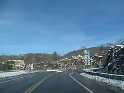 As the route approaches Little Falls, it makes a slight turn to the north, crossing over the Mohawk River (here part of the Erie Canal) and the CSX Railroad, on its way to an intersection with a divided highway carrying NY 5 and NY 167. NY 169 turns west here, following the highway for 0.22 miles (0.35 km)[1] toward Little Falls. The resulting overlap with NY 167 is a wrong-way concurrency as NY 169 northbound is concurrent to NY 167 southbound and vice versa. At East Main Street, NY 169 leaves NY 5 and NY 167 to follow East Main Street into the city. The street splits into a one-way couplet three blocks later, at which point southbound NY 169 is shifted one block south onto Albany Street.[3]