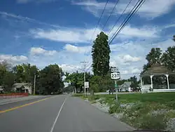 In the center of Byron, NY 237 meets NY 262, which becomes county-maintained as the eastern segment of County Route 13 (CR 13) east of NY 237. Past NY 262, NY 237 proceeds through the residential northern outskirts of the hamlet to Pumpkin Hill, the last community that NY 237 enters prior to crossing into Orleans County. Outside of Pumpkin Hill, the route passes through sparsely developed areas of Byron and Clarendon, serving the small hamlet of Honest Hill in the southern portion of the latter. NY 237 continues north to the hamlet of Clarendon, situated at the junction of NY 237 and NY 31A. At this point, NY 237 turns to follow a more northeasterly alignment toward the village of Holley, the largest community on NY 237. After another 2.5 miles (4.0 km) of rural surroundings, the route enters the Holley village limits in the town of Murray, becoming South Main Street and turning back to the north upon passing under the Falls Road Railroad south of the village center.[3]