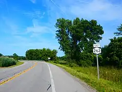 New York State Route 262 (NY 262) is an east–west state highway in Genesee County, New York, in the United States. It extends for 17.03 miles (27.41 km) across mostly rural areas dominated by cultivated fields, connecting NY 63 in the village of Oakfield to NY 19 in the village of Bergen. In between, the two-lane NY 262 serves the village of Elba and the hamlet of Byron, where it meets NY 98 and NY 237. NY 262 is situated several miles north of the New York State Thruway (Interstate 90 or I-90) and follows a routing parallel to that of the Thruway. The route was assigned as part of the 1930 renumbering of state highways in New York to a more northerly routing between Elba and Byron, but gradually moved onto its current Oakfield–Bergen alignment through a series of changes in the following decades.