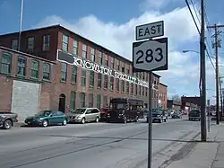 New York State Route 283 (NY 283) is an east–west state highway in Jefferson County, New York, in the United States. It extends for 5.79 miles (9.32 km) as a two-lane road from an intersection with U.S. Route 11 (US 11), NY 3, and NY 12 in downtown Watertown to a junction with NY 342 in the town of Le Ray. The route passes through mostly rural areas, with the exception of a dense commercial district around the highway's west end. NY 283 is one of three routes directly connecting Watertown's Public Square to Fort Drum; the others are US 11 and NY 3, which loosely parallel NY 283 between the two locations.
