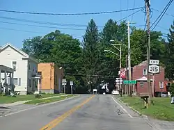 At the southern end, NY 315 begins in Waterville at an intersection with NY 12. Paralleling Big Creek, the route heads northwestward through mostly rural and residential land. The route, locally known as Buell Avenue along this stretch of its source, crosses several of the creek's tributaries as it progresses towards the hamlet of Deansboro, where it bends slightly westward and uneventfully terminates at NY 12B.[3] Approximately midway between Waterville and Deansboro is Forge Hollow. Here, the road makes an S-shaped turn around Big Creek and one finds a rock face with caves and a natural spring. The entire route is five miles long.