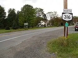 New York State Route 316 (NY 316) is a state highway in Madison County, New York, in the United States. It extends for 4.03 miles (6.49 km) in a northwest–southeast direction from an intersection with NY 46 in the city of Oneida to a junction with NY 31 in the hamlet of Oneida Valley, located in the town of Lenox. NY 316 serves as a connector between Oneida Lake and the city of Oneida, and it parallels Oneida Creek for its entire length. The route was assigned as part of the 1930 renumbering of state highways in New York, following what had previously been part of NY 31 during the 1920s.