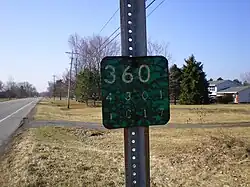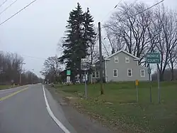 NY 360 began at an intersection with NY 272 at the Monroe–Orleans county line in the town of Hamlin. The route proceeded east on Morton Road, passing through a lightly populated area and crossing a pair of tributaries that feed into Yanty Creek.[5] After 1.50 miles (2.41 km),[1] Morton Road ended at an intersection with Redman Road.[5] This junction was once the southern terminus of NY 215;[6] however, it is now merely a junction between two county-maintained routes.[7] NY 360 turned south here to follow Redman Road for 0.5 miles (0.8 km) before resuming its eastward progression on Church Road.[5]
