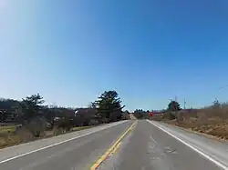 In January 1967, NY 38B was added to the state project list for the 1967–68 fiscal year. By this point, the county-maintained alignment was cracking and sinking in several locations, as well as some erosion.[8] In April, it was announced that design plans would be complete by August 1 for the reconstruction.[9] In November, the Governor of New York Nelson Rockefeller announced that bids would open on December 14 for the reconstruction project, costing $2.985 million (1967 USD).[10] In January 1968, the state announced that the contract went to the Triple Cities Construction Company of Binghamton. The $2,311,510 job would involve rebuilding the section in Tioga County with new 24 feet (7.3 m) wide roadway with 9 feet (2.7 m) shoulders. This would replace the old alignment, which only had 18 feet (5.5 m) of roadway. The project would also have special 12 feet (3.7 m) climbing lanes for hills, a new bridge over Crocker Creek, and improvements to six intersections along the road. In all the project would be completed by December 31, 1969.[11] The project was completed in October 1969, two months ahead of schedule.[12]