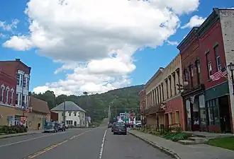 The route continues into the village, changing names from Coopers–Bath Road to East Morris Street. Just inside the village limits, NY 415 passes a long stretch of residences and a former railroad right-of-way. Near the center of Bath, the route veers off East Morris Street and onto East Steuben Street, a parallel street one block to the north serving more commercial areas of the village. After five blocks, NY 415 turns northward onto Liberty Street, which carries the route for another two village blocks to the downtown portion of the village. Here, NY 415 meets NY 54, which switches from West Washington Street to Liberty Street at this point. NY 415 turns west here, overlapping with NY 54 along West Washington Street, a two-lane street serving mixed-use areas. The concurrency ends in a commercial area on the village's west side, where NY 415 turns northward onto West Morris Street while NY 54 proceeds west to the Southern Tier Expressway's exit 38.[5]