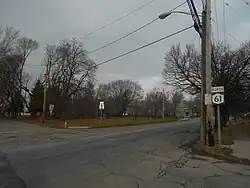 Gill Creek and NY 61 continue to run parallel for one more block before they separate ahead of Pine Avenue,[3] once known as NY 62A[4] and now designated as US 62 Business.[5] The intersection between Pine and Hyde Park Boulevard marks the southwestern limits of Hyde Park, one of the largest parks in the vicinity of the city. For the next dozen blocks, NY 61 acts as the divider between the residential neighborhoods of downtown Niagara Falls and the open spaces of Hyde Park, passing Sal Maglie Stadium as it heads north. At Linwood Avenue, the homes return to both sides of NY 61 as it approaches Porter Road, which carries NY 182. While Porter Road ends here, NY 182 turns north, joining NY 61 for two blocks to Ontario Avenue, where NY 182 turns west toward the Whirlpool Rapids Bridge.[3]