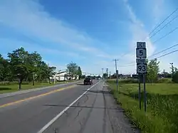 After NY 18, NY 93 curves to the southeast, serving another residential stretch ahead of a junction with Youngstown–Wilson Road (CR 36) on the eastern edge of Towers Corners. After this intersection, the homes give way to farms as the road heads into rural areas of the town. The route continues on a southeast track through Porter, passing a mixture of rural and residential areas on its way into the hamlet of Porter Center, where NY 93 enters an intersection with Porter Center Road (CR 57). Another southeastward stretch brings the route across Twelvemile Creek and into the hamlet of Ransomville, where NY 93 becomes the community's main street. Through Ransomville, NY 93 retains the Youngstown–Lockport Road name, intersecting with Ransomville Road (CR 17) in the hamlet's business district.[3]