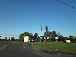 The route initially serves a line of homes as it heads along Robinson Road; however, it soon enters a commercial district surrounding the road's intersection with NY 78 (Transit Road). At this point, the Lockport–Pendleton town line turns south to follow NY 78, leaving NY 93 fully within the town of Lockport as it runs eastward past another stretch of homes. Not far from NY 78, NY 93 changes names to Dysinger Road at an intersection with Beattie Avenue (CR 14) and Raymond Road (CR 85). The junction also marks a shift in the road's surroundings as the homes give way to open, rolling terrain. NY 93 continues eastward for several miles to the town of Royalton, where it meets Riddle Road (CR 35) and Akron Road (CR 142) at adjacent intersections just east of the town line.[3]