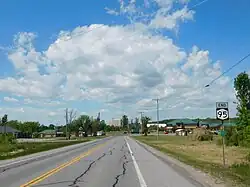 The origins of NY 95 date back to the early 1910s when the highway was improved to state highway standards by the state of New York as part of two separate projects. North of Bombay, the road was rebuilt as part of a contract let on February 18, 1910, that also covered part of what is now NY 37. It was added to the state highway system on November 28, 1910, as State Highway 820 (SH 820). The section between Moira and Bombay was reconstructed under a contract awarded on March 22, 1911, and accepted as a state highway on September 16, 1913, as SH 885. Both numbers are unsigned.[4] In the 1930 renumbering of state highways in New York, NY 95 was assigned to an alignment extending from Saint Regis Falls in the south to the vicinity of Hogansburg in the north. North of Moira, the route was overlaid on SH 885 and SH 820.[2][5] NY 95 was truncated to US 11 in Moira c. 1937,[6][7] and its former alignment south to Saint Regis Falls is now maintained by Franklin County as CR 5.[8][9]