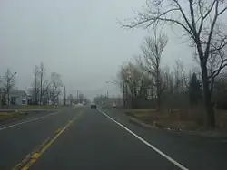 The commercial strip ends 2.5 miles (4.0 km) east of the Thruway in the Depew village limits, at which point the road narrows to four lanes as it passes under a branch line leading from the nearby main line of the CSX Transportation. Walden Avenue comes close to the main line tracks here, but it gradually moves away from the railroad as it enters a commercial and residential area of Cheektowaga. Here, the road makes a slight turn to the northeast, beginning a linear 10-mile (16 km) stretch that ultimately takes Walden Avenue out of the Buffalo suburbs. The road's surroundings remain mixed through its intersection with Transit Road (NY 78) north of Depew's village center. After Transit Road, Walden Avenue enters the town of Lancaster and crosses the northern fringe of the village of Lancaster, connecting to Central Avenue (County Route 57 or CR 57), the village's main north–south street.