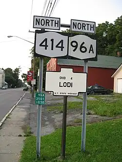 NY 96A and NY 414 continue northward as a two-lane rural roadway through Lodi, entering the town of Ovid near West Wyckoff Road. In Ovid, the two routes continue along the rural highway, entering the village of Ovid, passing Union Cemetery, and intersecting with CR 132 (Gilbert Road). At that intersection, NY 96A and NY 414 gain the Main Street monikers, crossing the village as a two-lane residential street, intersecting with CR 139. At the north end of the village, NY 96A and NY 414 intersect with NY 96 (North Town Line Road). At this intersection, NY 96A turns west along North Street, while NY 414 and NY 96 form a concurrency northward into the town of Romulus. Continuing west, NY 96A enters the town of Romulus, intersecting with the terminus of CR 139 as a two-lane rural roadway. After crossing over a former railroad right-of-way, NY 96A enters the hamlet of Gilbert, intersecting with CR 132 once again, where the route makes a gradual bend to the north near CR 132A.[4]