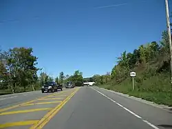 The River Road portion of NY 990L is initially less developed as it passes by riverside homes to the west and forested mountains to the east. Near a junction known as Hawley Corners, the amount of development along the highway increases as NY 990L passes by warehouses and small commercial establishments. At Hawley Corners itself, NY 990L ends at NY 23 and East River Road becomes CR 32 once more.[3][4] Typically, reference routes are not signed; however, NY 990L is one of four such routes in New York that is at least partially signed. The East River Road stretch of NY 990L is the only section of the route that is signed; no other signs exist, including on NY 12 and NY 23 as reassurance markers.[5]