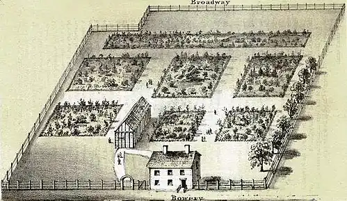 The Vauxhall Gardens was a pleasure garden and theater in New York City. It was named for the Vauxhall Gardens of London.[1]: 132 Though the venue passed through a long list of owners, and suffered buyouts, closings, relocations, and re-openings, it lasted until the mid-19th century.[2]: 45