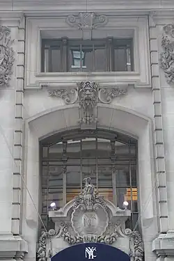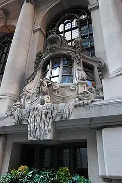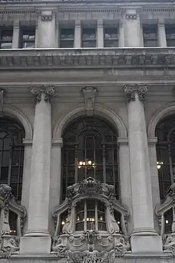 The first story is treated as a podium and contains windows with grilles.[28] On the second and third stories, the westernmost three bays are placed within a small colonnade, which consists of a Doric-style pier at either end and two Ionic-style engaged columns in the center.[32] Each of the westernmost three bays contains a double-height, round-arched window.[27] There is a bay window in the lower part of each archway, which is surrounded by an ornate frame.[27][33] These frames are patterned after the sterns of 18th-century men-of-war,[34][35] variously described as Baroque boats,[27][36] Dutch yachts,[26][33][37] and Spanish galleons.[38][39] According to yachting historian and longtime NYYC member John Rousmaniere, the shapes of the frames most closely resemble a Dutch yacht.[29][37] These frames also contain carvings of seaweed, waves, and garlands, which hang from console brackets below the center of each bay window, as well as dolphins on either side of the console bracket.[28][34] The original plans had called for torchères to be installed along the facade, but this was never carried out.[20]