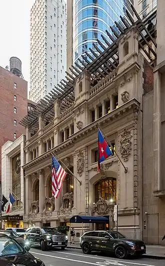 The club began renovating the building's interior in 1985, restoring chandeliers and other architectural details to their original condition.[118] The building was further designated as a National Historic Landmark in 1987.[7][122] After the interior modifications were completed, the club started renovating the exterior in 1992 at a cost of $600,000.[37] The NYYC requested permission from the LPC to restore the flagpoles and pergola on the facade. The club also planned to remove the gray paint on the facade, since the paint had decreased the porosity of the stone, which in turn had caused moisture problems.[20] The following year, Eliot Soffes of architectural firm Paino/Soffes designed a restoration of the pergola at a projected cost of $35,000. The pergola was rebuilt entirely for aesthetic purposes, as the rooftop terrace under the original pergola was not rebuilt.[123] These renovations were conducted in advance of the club's 150th anniversary.[124]