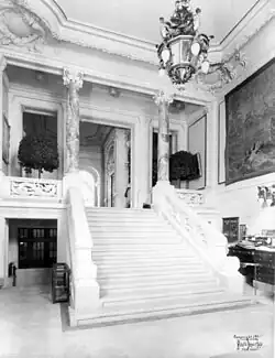 Immediately inside the main entrance, a short staircase ascends to a double-height entrance hall.[42] This space contains Caen stone walls and a marble staircase in the center, leading to the model room on the second floor.[25][43] Originally, the clerk's office was to the right (east) of the hall, while the visitors' room, coatroom, letterboxes, and telephones were to the left.[33] The visitors' room was decorated with photographs of large yachts.[38] All non-members were originally directed to the visitors' room, where they waited for a member to accompany them upstairs;[40] this space was later converted into a reception desk.[43] The coatroom was at the bottom of the grand staircase.[18][19] On the opposite side of the entrance hall was a stair leading to the club's cafe.[33][42]