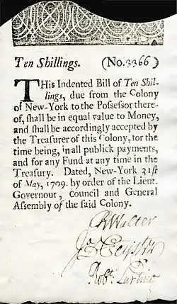 The pound was the currency of the province and state of New York until 1793. Initially, sterling coin circulated along with foreign currencies. This was supplemented by local paper money from 1709. Although these were denominated in £sd, they were worth one third less than sterling,[1] with one New York shilling worth 8d sterling.