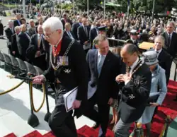 The New Zealand Herald of Arms Extraordinary attends the Governor-General (or the Sovereign, if present) on ceremonial occasions which include the swearing-in of a new Governor-General, investitures of Royal honours, and the ceremonial opening of Parliament.[1] Since at least 2002 the New Zealand Herald of Arms Extraordinary has been the person appointed by the Governor-General to proclaim the dissolution of Parliament.[3][4][5][6]
