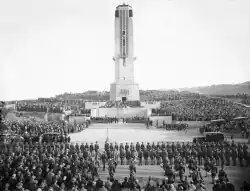 Work on the carillon was completed in time for an Anzac Day 1932 dedication viewed by a crowd of 10,000 people.[6] Various dignitaries gave speeches, Governor-General Lord Bledisloe switched on the Lamp of Remembrance on top of the tower, and then the carillon played the national anthem and several hymns, accompanied by the singing of the crowd.[6] The Evening Post described the sound of the carillon as 'magic from the skies'.[11]