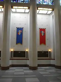 On each of the two side walls of the Sanctuary a large cross forms the background for the coats of arms of the main towns of the nine provinces of New Zealand. These crosses symbolise the sacrifices made by New Zealanders in times of war.[13]