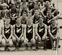 A New Zealand rowing eight was selected but was unable to travel to the games because of lack of funds.[13][14] The chosen team consisted of Hubert McLean (Wellington), Crosby Morris (Canterbury),[15] F. H. Brown (Canterbury), Clarrie Healey (Wanganui),[16] Mick Brough (Otago), Vic Olsson (Marlborough), L. Brooker (Auckland), Bob Stiles (Canterbury), G. St. Clair (Auckland), and G. Duggan (Canterbury). The reserves were Glen Stiles (Canterbury)[17] and N. Webber (Auckland).