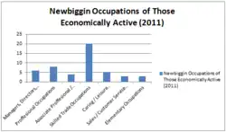 Newbiggin has had a relatively small population throughout history. At the 2011 census the combined population of the parishes of Newbiggin and Bishopdale parishes was 108,[8] of which Newbiggin was estimated at 80 and Bishopdale at 30.[1] In 1881 the population of Newbiggin was only 60 people.[9] The average age of the population is also relatively high, with 46.3% of those living there being 60 or over and the mean age being 53.5.[10] Of the total population who are aged 16–74, there are 31 people who are economically active (both part-time and full-time). Strangely enough, all of these 31 are actually self-employed.[11]