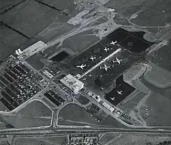 In 1929, Newcastle-upon-Tyne City Council set up a special committee to investigate the potential for building an airport to serve the North-East of England, considering 18 locations before selecting a site at Woolsington, about 5 mi (8.0 km) northwest of the city centre.[5] The airport was opened on 26 July 1935 as Woolsington Aerodrome by the Secretary of State for Air, Sir Phillip Cunliffe-Lister. Incorporating a clubhouse, hangar, workshops, fuel garage and grass runway, it cost £35,000 to build.[6] The airport became the base for the Newcastle upon Tyne Flying Club, which moved from its previous home at Cramlington Aerodrome and ran the new airport on behalf of the council.[7] On 1 June 1939, No. 43 Elementary and Reserve Flying Training School, operated by Newcastle Flying Club and equipped with a mixture of de Havilland Tiger Moths, Miles Magisters and Hawker Hinds opened at Woolsington, as one of a large number of civil-operated flying schools set up to train aircrew for the RAF. The school was disbanded on 3 September 1939, with the outbreak of the Second World War.[8][9]