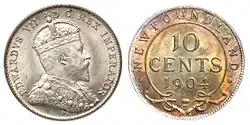 The Newfoundland ten cent coins exist as a bronze pattern with the adopted obverse from the New Brunswick coin (the words Newfoundland substitute New Brunswick). This design adoption is similar to that used for Newfoundland five cent coins.