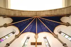 It has a cruciform plan, with the entrance and vestibule at the west end and a long nave leading into a short five-sided apse in the east. The transepts to the north and south are double-gabled. The nave is 88 feet (27 m) long by 42 feet (13 m) wide, including the aisles on either side.[9] There is a long barrel-vaulted plaster roof, which is a "simplified simulation" of the original timber roof destroyed in the 1969 fire.[10] There are a number of notable stained glass windows depicting biblical scenes and allegories. These escaped damage in the 1969 fire.[5]