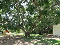 The school grounds contain mature trees, including two large fig trees (Ficus, sp.) along the Banks Street boundary, in front of Block A, and a row of four large fig trees and a kauri pine north of the tennis courts (along the former police reserve boundary), some of which, according to aerial photos, were planted prior to 1936. A mature Grey Gum (Eucalyptus sp.) is located to the west of Block B.[1]