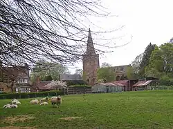 The parish church, called St Michael and all Angels,[3] is a former chapel of a parent church at Badby. The benefice has always been Badby-cum-Newnham, with the vicarage of Badby. As the church is perched high on a bank, the churchyard descends steeply east and south. The chancel, the north aisle and the present nave were built in the early 14th century, on the site of a 12th-century chapel. The western tower was built in the late 14th or early 15th century abutting the west wall and standing on three open arches. The tower has contained six bells since 1660. They were rehung on a new iron frame by John Taylor & Co in 1940.