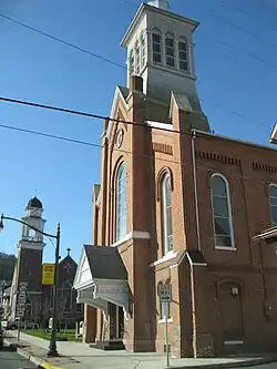 In 1849 the Pennsylvania Railroad had laid tracks through Third Street downtown. The PRR purchased the struggling canal in 1857, but kept the waterways open until 1889 when the Johnstown Flood demolished it. By 1905, the PRR began construction of a new trackline along the former towpath which remains today.[6] There was a small freight yard where railcars and cargo could be transferred to standard gauge, and in 1890 Newport was the eastern end of the Newport and Shermans Valley Railroad.