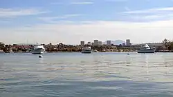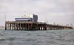 The north end of the Newport Harbor channels surrounding Lido Isle has several small business centers and was at one time used as a home by the fishing fleets. On the North East side of the channel, the Lido Marina Village now acts as the local port to many "Newport Party Boats" that can be rented for events, as well as small merchants and local restaurants. It also hosts the area boat show each year, and an organic "Farmers Market"[18] on Sundays, in addition to being the port for the local Gondola Company.[19] In 2014, the center was closed for a renovation.[20] The Lido Village was reopened in 2017 after a complete renovation.[21]
