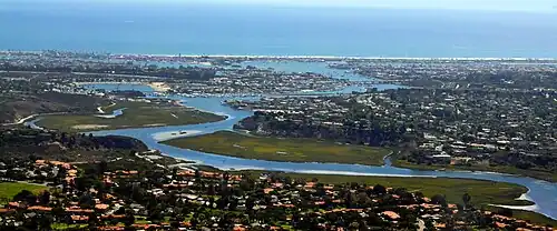 Upper Newport Bay is an estuary that was formed by a prehistoric flow of the Santa Ana River. Today it is fed by a small stream from San Diego Creek. Much of Upper Newport Bay is a protected natural area known as the Upper Newport Bay Ecological Reserve, established in 1975.[23]