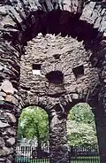 The tower is located at the upper end of the plot behind the now-demolished mansion built by Benedict Arnold, the first colonial governor of Rhode Island, who moved from Pawtuxet to Newport in 1651.[7][8] In 1677, Arnold mentions "my stone built Wind Mill" in his will; the site for his burying ground is between this mill and his mansion and still exists today.[9] The phrase has therefore generally been accepted as referring to the Newport Tower, and is evidence that the tower was once used as a windmill. Still, others have contested that locals remembered the tower was previously a functioning corn mill, and that since it had a ground-level fireplace, it couldn't have been built as a windmill.[10]