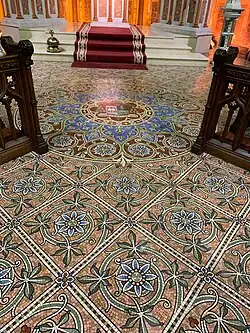 The Chapel of the Blessed Virgin is located to the left of the main Sanctuary displays the same ornate decoration in marbles and mosaics. A number of invocations from the Litany of the Blessed Virgin Mary, all worked in mosaics with accompanying symbols mainly in gold, are seen on the wall around the altar. The altar itself, in Carrara marble generally, carries columns in Sienna and Rosso Corallo, with small panels in Levanto Red. The tabernacle door has a gold finish and above stands a marble statue Our Lady of Lourdes. The two small panels in the marble reredos present the Annunciation and the Coronation of the Virgin. The stained glass window over the altar shows The Virgin Mary with the Child Jesus. The Virgin's parents, St. Joachim and St. Anne are shown in mosaics on either side. The sanctuary lamp in this chapel was presented by the Children on Mary Sodality, on the occasion of the Consecration in 1925. To the Left of the altar is a stained glass window showing Christ blessing the Little Children. The ceremonial processional entrance to the sacristy in located in the Lady Chapel.[4]