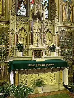 Saint Joseph's Chapel to the right of the main sanctuary shows a similar artistic finish in mosaics and marbles to the Lady Chapel. The altar is mainly in Carrara marble relieved by columns in Sienna and Porta Santa. A gilt door, centred by red onyx columns encloses the tabernacle over which stands a marble statue of St. Joseph. In the Marble reredos to the left, is a panel showing the espousal of St. Joseph to the Virgin Mary, and on the right a similar panel depicting the Holy Family in their Nazareth workshop. The Sanctuary wall carries a number of invocations to St. Joseph set in gold mosaics. The stained glass window over the altar shows the figures of St. Joseph and the infant Jesus in the centre panel. St. Patrick and St. Brigid in mosaics appear to the left and the right respectively. The altar in this chapel was the gift of the Holy Family Confraternity in 1908, because of this the Chapel is commonly referred to as the 'Holy Family Chapel'. The sanctuary lamp in front of the altar was presented Mr. James Fleming, Newry, in 1925.[4]
