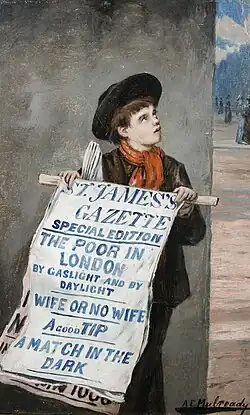 The paintings of London artist Augustus Edwin Mulready (1844–1904) told his audience that when they see a newsboy hawking papers they should see him as a symptom of poverty and urban malaise.[13]