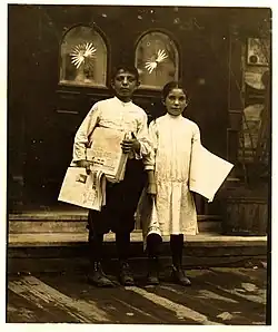 American photographer Lewis Hine crusaded against child labor in the United States in the early 20th century by taking photographs that exposed frightful conditions, especially in factories and coal mines. He photographed youths who worked in the streets as well, but his photographs of them did not depict another appalling form of dangerous child labor or immigrant poverty, for they were not employees. The symbolic newsboy, influenced by Hine's photography, became an iconic image in discourses about childhood, ambition and independence.[8]