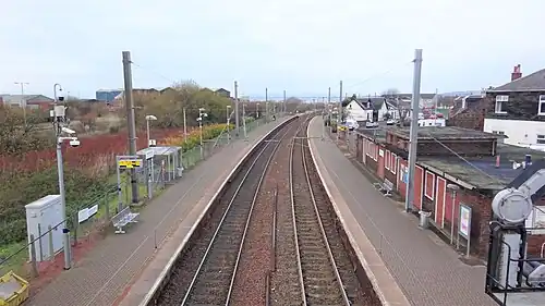 Station buildings still exist on the southbound platform, but they have been closed to passengers for many years. A footbridge is present here and a small shelter is present on the northbound platform.