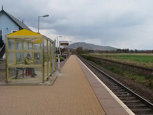 Newtonmore railway station serves the village of Newtonmore, Highland, Scotland. The station is managed by ScotRail and is on the Highland Main Line. The station is 68 miles 62 chains (110.7 km) from Perth, between Dalwhinnie and Kingussie, and has a single platform which is long enough for a ten-coach train.[4] It is currently the only station on the Highland Main Line to have one platform, although the former second platform can still be seen adjacent to the first platform.[4]
