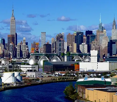 The Newtown Creek Wastewater Treatment Plant is the largest sewage treatment facility operated by the New York City Department of Environmental Protection.[1] Since 2010, its eight metallic "digester eggs", which are 140 feet (43 meters) tall and dramatically illuminated with blue light at night, have made it a local landmark,[2] particularly to motorists on several nearby roadways in the New York City boroughs of Brooklyn, Queens, and Manhattan.[1] It is located on the Newtown Creek in Brooklyn's Greenpoint neighborhood along Greenpoint Avenue.