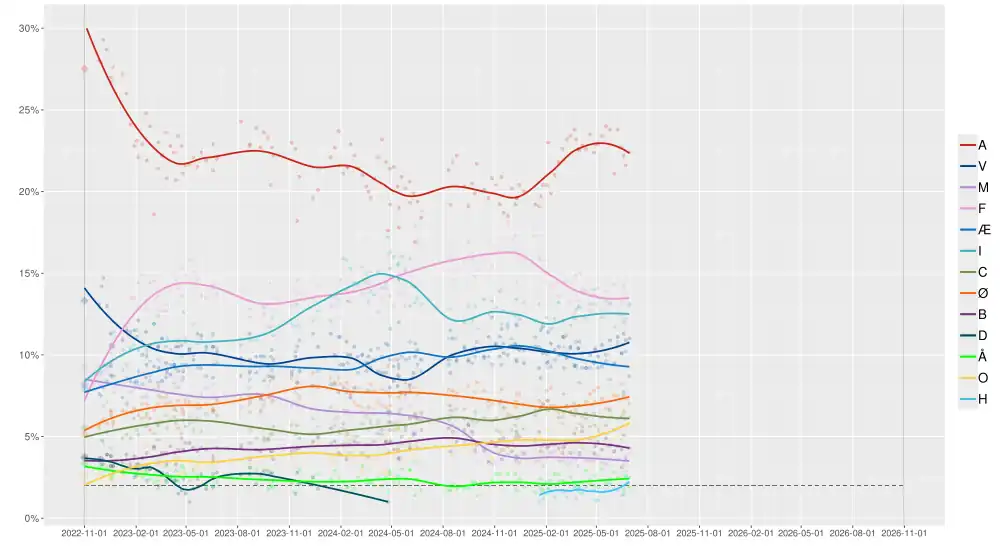 The previous general elections were held on 31 October 2022 in the Faroe Islands and on 1 November in Denmark and Greenland. The elections led to a narrow victory for the red bloc.[3] Following the elections, a centrist government led by Prime Minister Mette Frederiksen and consisting of the Social Democrats (A), Venstre (V) and the Moderates (M) was established.[4]