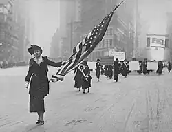 Her father died in 1918 while McMein was overseas entertaining the troops. She moved her mother Belle from Quincy, Illinois to live with her in New York.[4] She was an "ardent supporter" of women's political, sexual, and economic rights.[5] By 1920, McMein had walked in suffrage parades, traveled overseas extensively, and had ridden in Count Zeppelin's dirigible.[6] She rode across an Arab desert with a woman journalist and friend and was proposed to by an Arab sheik in Algiers. McMein, who was a talented musician, had written an opera by that time, too.[6] In 1921, McMein was among the first to join the Lucy Stone League, an organization that fought for women to preserve their birth names after marriage in the manner of Lucy Stone.[1][27]