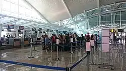 Open to the public on 17 September 2014, the new Domestic Terminal area is 65,800 m2 (708,000 sq ft) or four times larger than the old one. It can serve up to 9.4 million passengers a year, has 62 check in counters, four transit and transfer counters, 19 ticket counters, eight boarding gates and seven arrival gates which are provided by five aviobridges (garbarata) and 5 unit conveyor belts.[22]