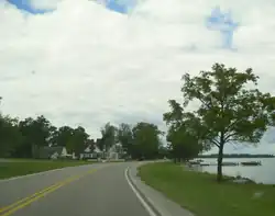 North of the bridge, the route descends the Niagara Escarpment near Brock's Monument, a column which commemorates the death of Sir Isaac Brock during the Battle of Queenston Heights. At the bottom of the escarpment, the route passes the village of Queenston.[8] The parkway meanders north, parallel to the river, with houses lining the western side. Approaching the town of Niagara-on-the-Lake, the road becomes known as Queen's Parade. It diverges from the river and travels northwest towards the town, ending at Fort George.[3]