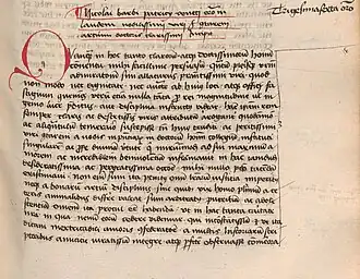 A collection of his correspondence—eleven letters in total—is found in two manuscripts, Lat. XIV 256 and 257 in the Biblioteca Marciana.[1] They cover the period 1438–1442.[6] Included are letters to Paolo Barbo, Isotta Nogarola, Antonio Beccadelli, Andrea Trapesunzio, Tommaso Pontano and Jacopo Rizzoni, as well as letters from Nogarola and Giovanni Pontano. Some of his correspondence is preserved outside of the collection. This includes two further letters to Nogarola and one from her, letters to and from Francesco Barbaro and letters from Maffeo Vallaresso and Guarino Veronese.[2] In his letter to Tommaso Pontano dated 24 November 1439, Barbo defended Nogarola from anonymous accusers.[3]