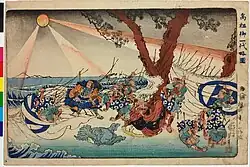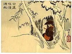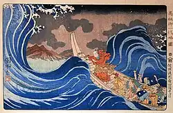 According to Nichiren's own account, he was sentenced to exile but was brought to Tatsunukuchi beach in Shichirigahama for execution. According to some traditional accounts, the execution was stopped at the final moment as "a brilliant orb as bright as the moon" arced over the execution grounds, terrifying Nichiren's executioners.[72] Modern scholars have proposed alternative narratives for this story and question its historicity.[20][58]: 257, 436 (note 99) Whatever the case, Nichiren himself believed he had undergone a transformative experience.[20] After this event, Nichiren was exiled to Sado Island. This incident has become known as the "Tatsunokuchi Persecution" and was regarded by Nichiren as a death-and-resurrection turning point.[58]: 257–258, 436 (note 100) [41]: 58 In the Nichiren tradition this is called his moment of Hosshaku kenpon (発迹顕本), translated as "casting off the transient and revealing the true"[73] or "outgrowing the provisional and revealing the essential."[74]