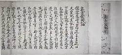 Nichiren's teachings developed over the course of his career and their evolution can be seen through the study of his writings as well as in the annotations he made in his personal copy of the Lotus Sutra, the so-called Chū-hokekyō.[92]: 363 Some scholars set a clear demarcation in his teachings divided by his arrival on Sado Island, whereas others see a threefold division of thought: (1) up to and through the Izu exile, (2) from his return to Kamakura through the Sado Island exile, and (3) during his years at Minobu.[92]: 252–253 [93]: 238 According to Anesaki, Nichiren, upon his arrival at Minobu, quickly turned his attention to consolidating his teachings toward their perpetuation. The scope of his thinking was outlined in an essay Hokke Shuyō-shō (法華取要抄; "Choosing the Heart of the Lotus Sutra"), considered by Nikkō Shōnin as one of Nichiren's ten major writings.[94][41]: 98